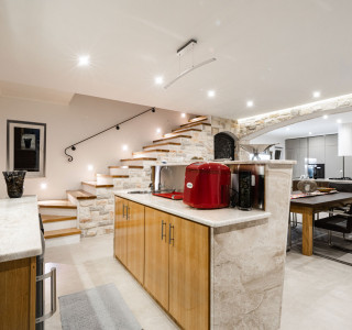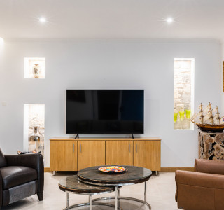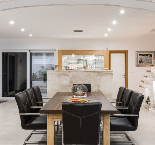 Wenn Sie das Haupttor betreten, werden Sie zur Eingangstür in den fantastischen offenen Wohnbereich geführt. Es gibt eine riesige voll ausgestattete Küche, ein Wohnzimmer mit einem schönen Sofa neben dem großen Fernseher und natürlich einen Essbereich mit Tisch für alle und einem großen Barbereich. Der tollste Bereich, um zu speisen und Ihren Wein oder Ihre Cocktails zu genießen, ist natürlich draußen, genau dort am riesigen Marmortisch mit sehr bequemen Sitzplätzen.