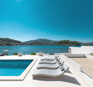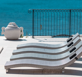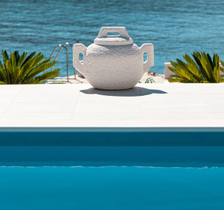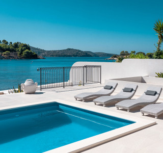 Dieses architektonische Juwel befindet sich, wie ein Wachturm, auf dem Gipfel der erstaunlich schönen Bucht, mit den verankerten Traumbooten zu Füßen. Die Hauptterrasse im Erdgeschoss bietet den wahrscheinlich exklusivsten Blick auf das Mittelmeer.
