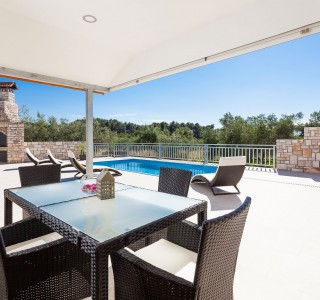 Es gibt einen großen überdachten Essbereich mit Sommerküche im Eck der Poolterrasse. Der Poolbereich hat ausreichend Platz für Spaß und Sonne mit einer Außendusche und einer Toilette. Seitlich vor dem Haus gibt es einen hübsch eingerichteten Grillbereich.
