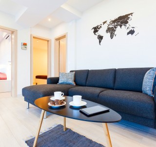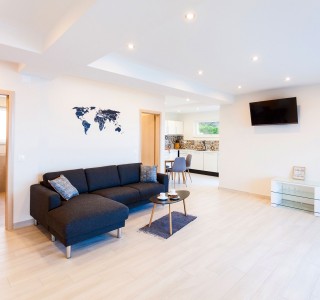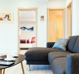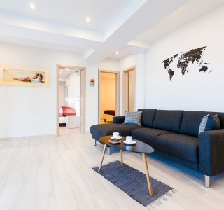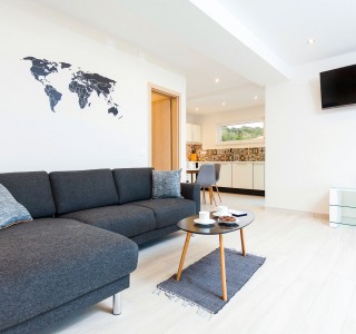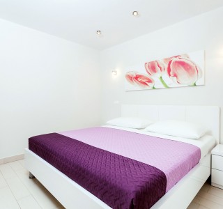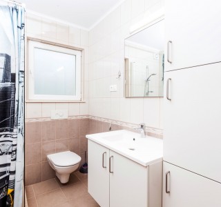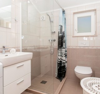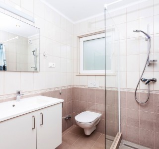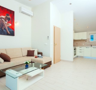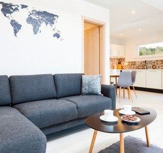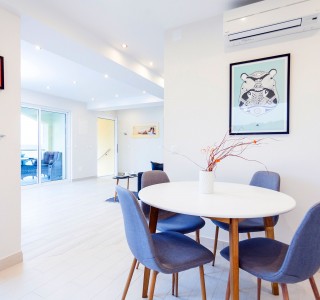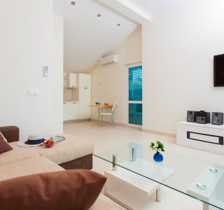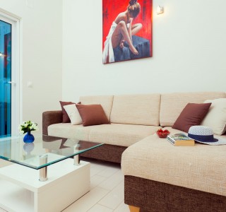 Upstairs apartment also has two bedrooms. A master bedroom has a king size bed and the terrace in front. The other bedroom has separate beds, great for kids. There is a modern bathroom upstairs, next to the bedrooms and the entrance to the living area. There is a very big open space of the dining area, kitchen and the living room, with a great terrace in front, very modern and equipped with style and class.