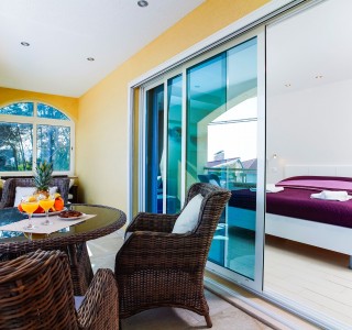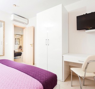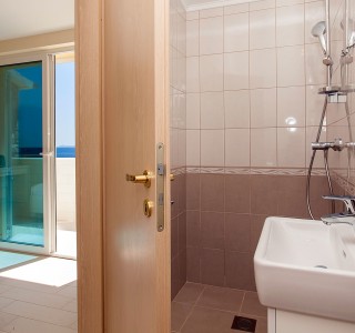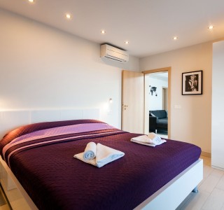 In the apartment downstairs there is a wide living area that opens up from the entrance door. The kitchen and the dining tables are in the side extension. There are two bedrooms with king size beds and a modern bathroom on the side. Master bedroom has a spectacular terrace with a breakfast table and a lounge set.