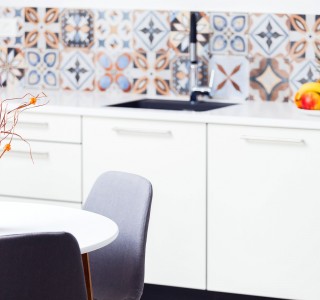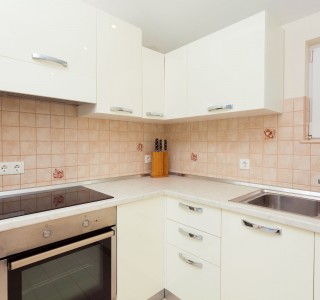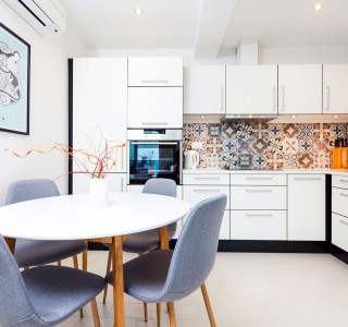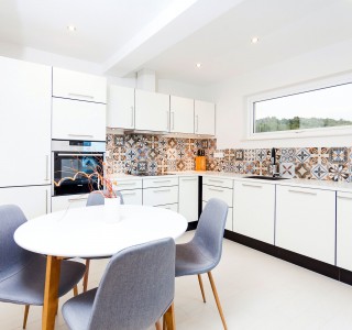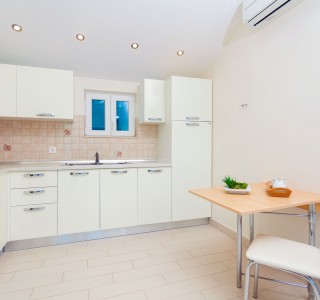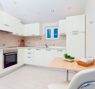 The kitchen is very modern, fully equipped, with a nice dining set for four persons.