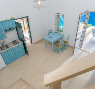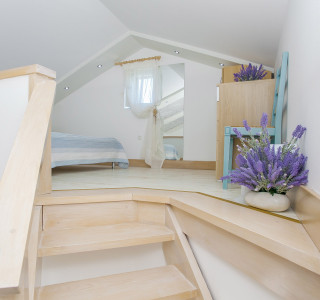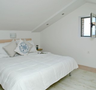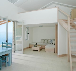 The stairway takes you down to the mutual dining area with a big stone table to sit all people. There is a large bbq there. From there you access two cottages on the side, both identical. Each of these two upper cottages have some 42m2, with sleeping area on the attic above the living room and the bathroom.